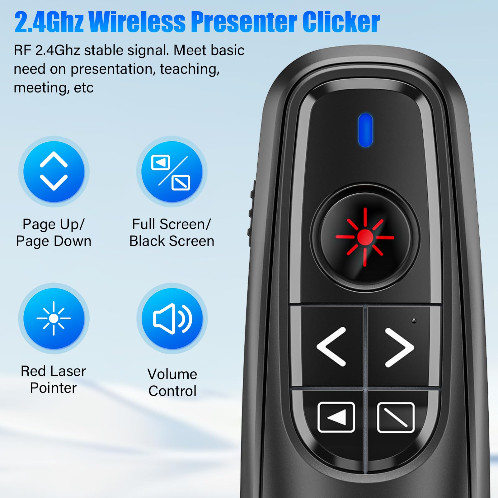- INTUITIVE CLASSIC PRESENTATION POINTER WITH VOLUME CONTROL: This presentation remote meets the classic demands of red laser pointer, page up, page down, page left, page right, switch windows, full screen, black screen and volume control. This computer clicker for presentations is a good assistant in your teaching,coaching,speeching,meeting or conference presentations, and this laser pointer for presentation also works as a cat chase toy to entertain your pets with the bright red laser light.