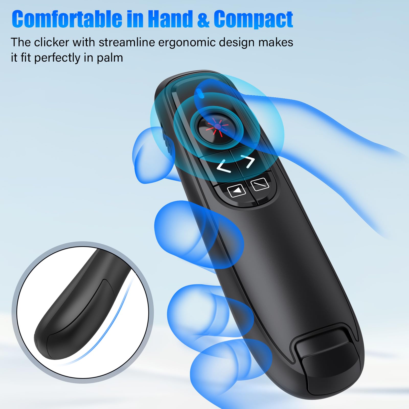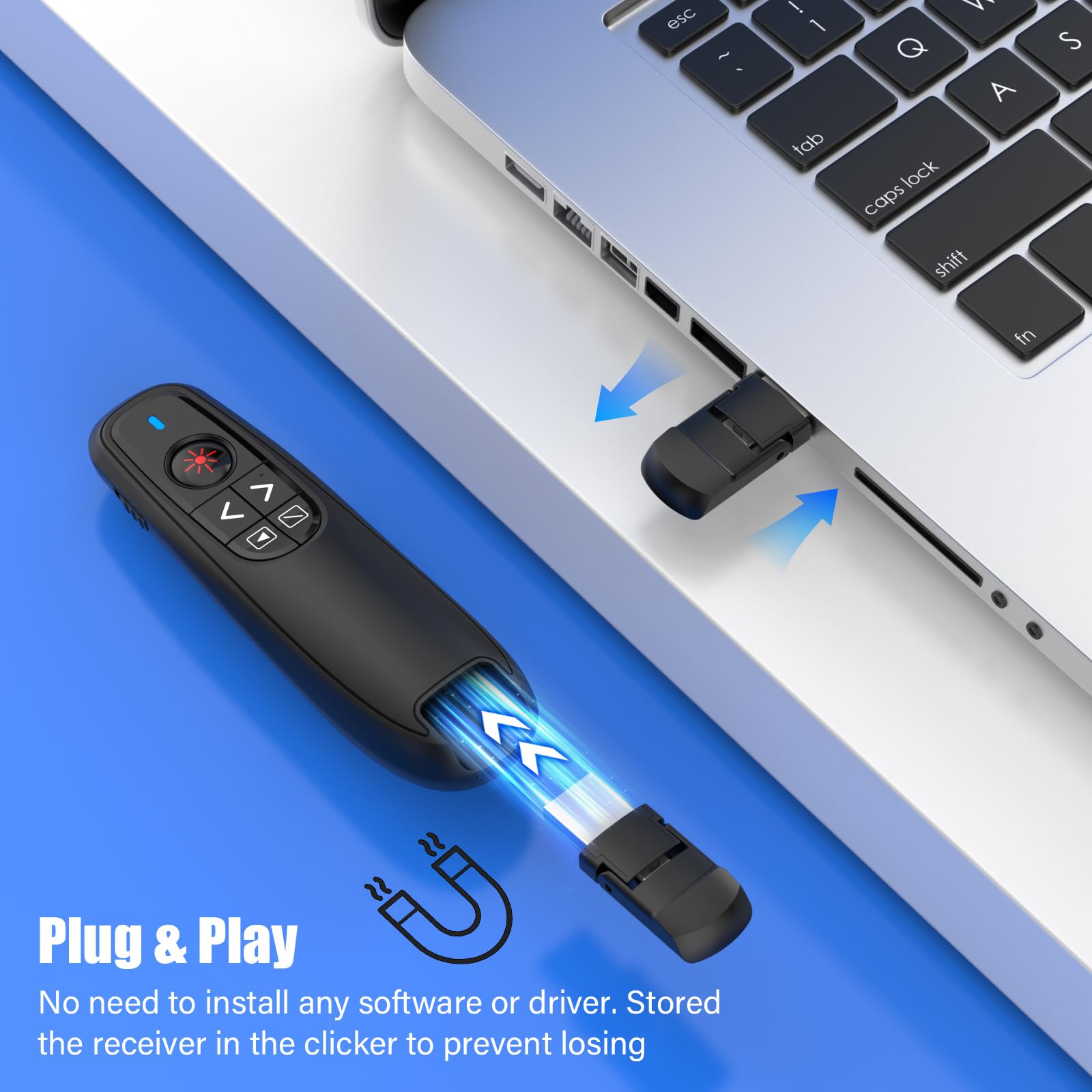 - 2-IN-1 USB A-TYPE C RECEIVER & PLUG AND PLAY: The 2-in-1 USB A and USB C connector make the clicker for powerpoint presentations plug-and-play, no need to install any software. The USB A&C receiver is adopted RF 2.4Ghz technology to maintain the steady signal reception and is stored into the remote clicker for presentations to prevent lossing. You need 2psc AAA battery installed into the wireless presenter remote to power it.(NOTE: The AAA batteries are not included in the package.)