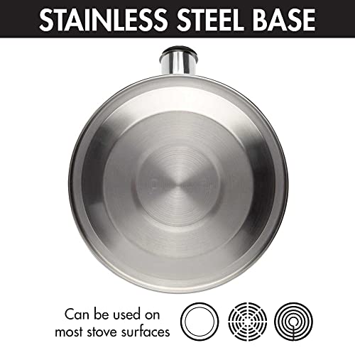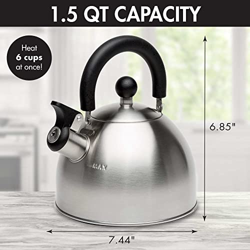Primula Stewart Whistling Stovetop Tea Kettle Food Grade Stainless Steel, Hot Water Fast to Boil, Cool Touch Folding, 1.5-Quart, Brushed with Black Handle